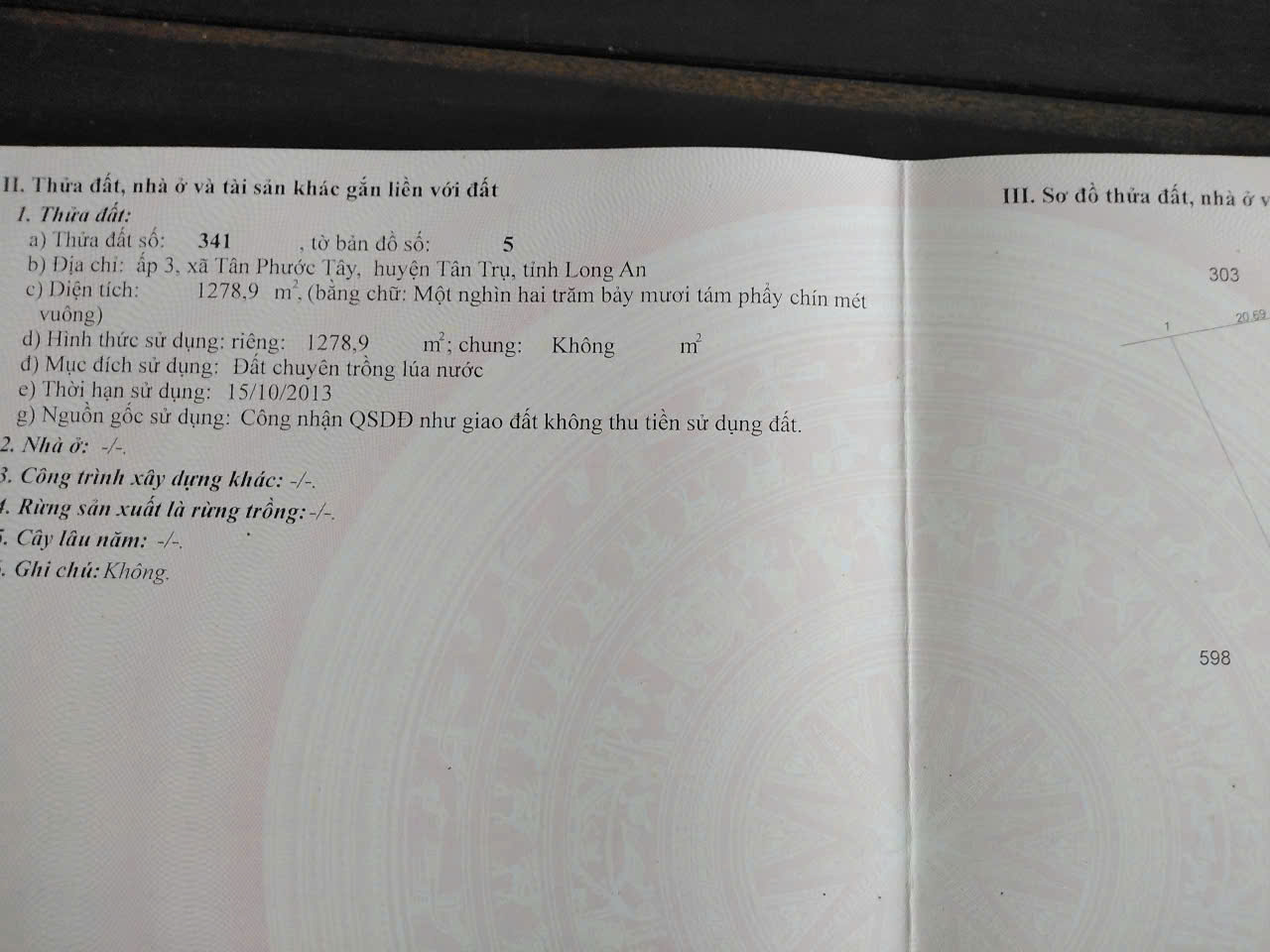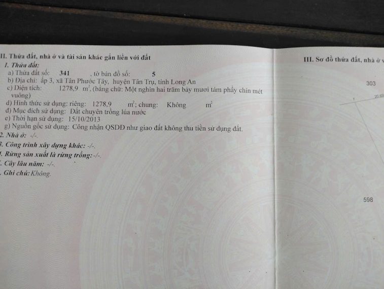* Đất nằm ở vị trí thuận lợi cho trồng trọt và tưới tiêu nhờ tiếp giáp sông, nguồn nước ổn định. Trong đó có 1 miếng diện tích 970m², đất trồng cây lâu năm.