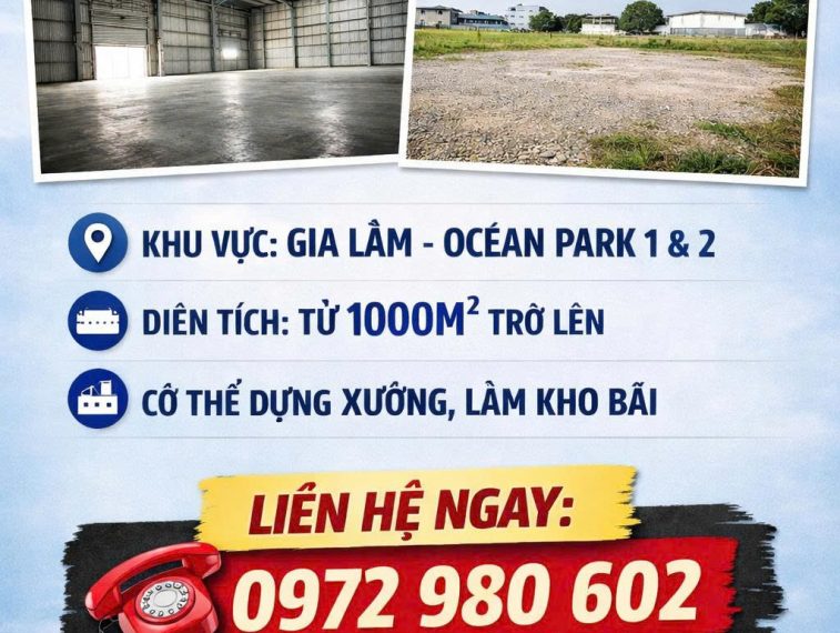 CẦN TÌM GẤP KHO HOẶC ĐẤT DỰNG XƯỞNG – KHU VỰC GIA LÂM, OCEAN PARK