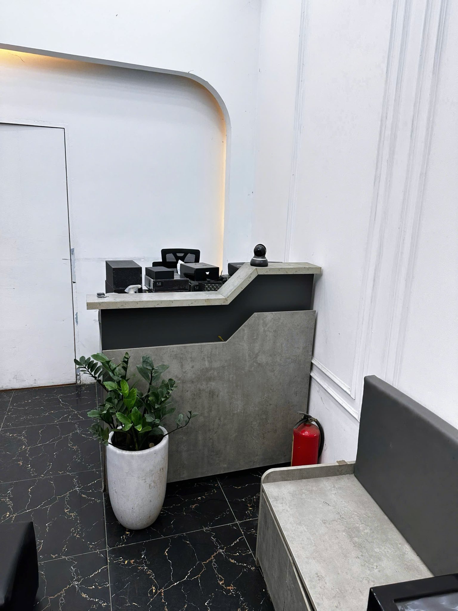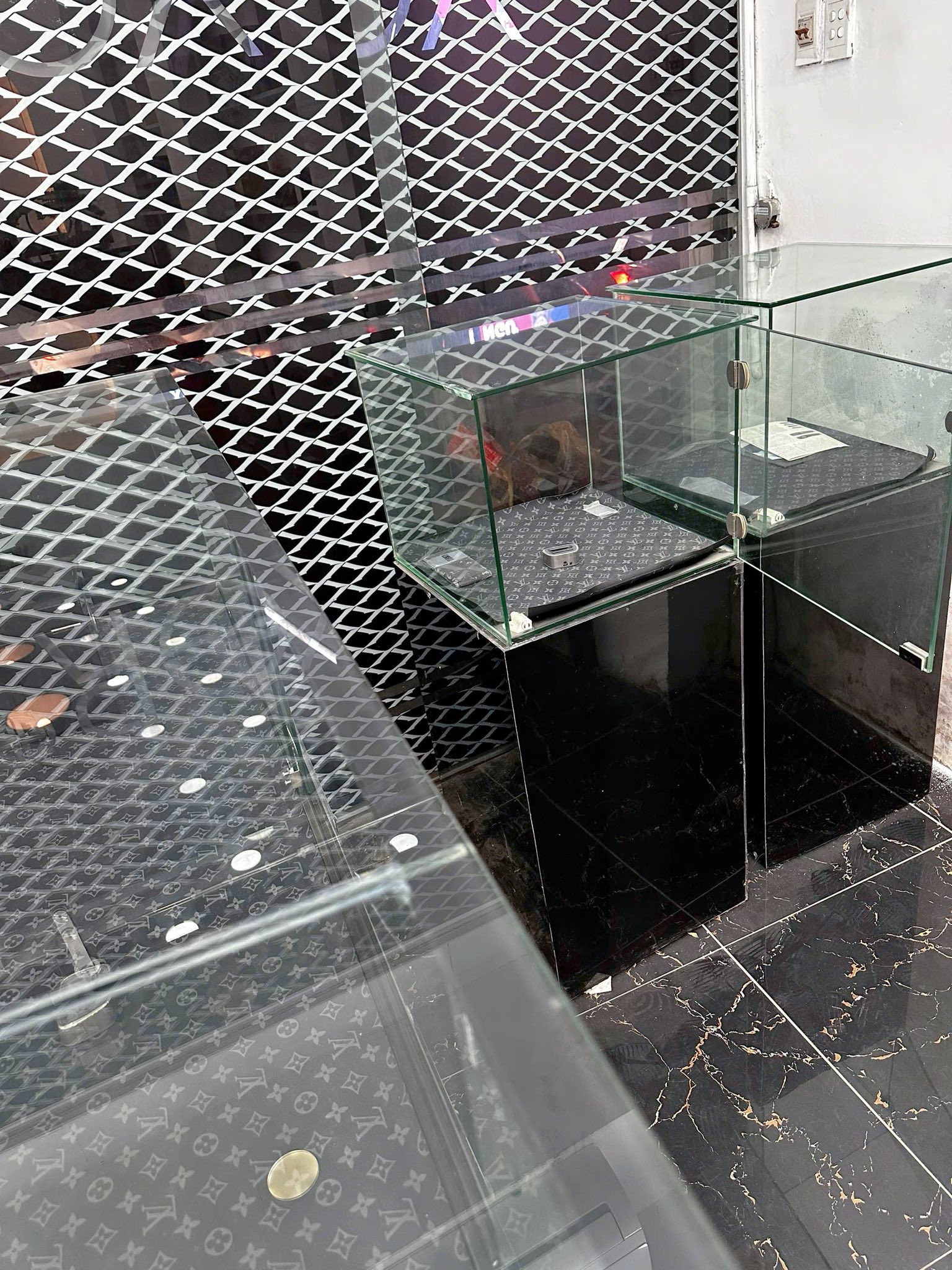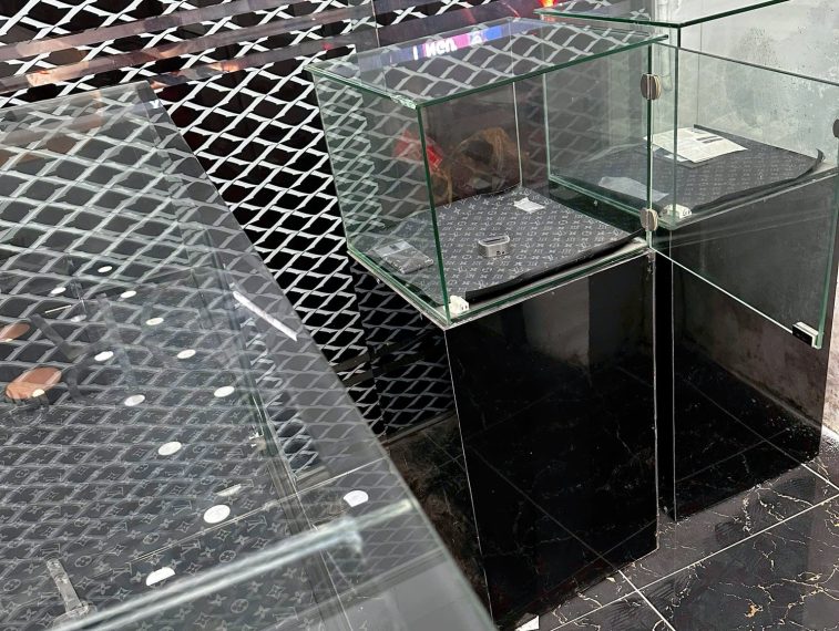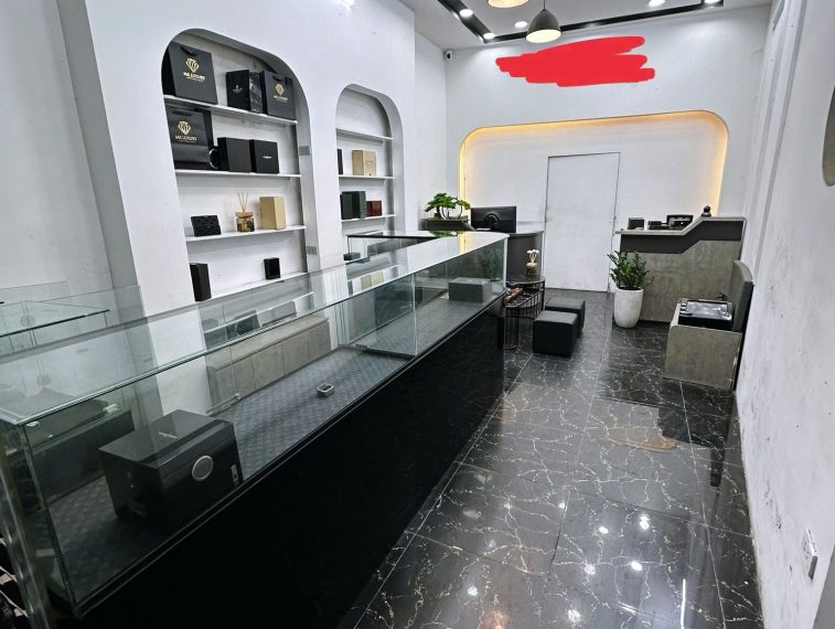 -Hệ tủ kính trưng bày ,2 bàn làm việc lớn, hệ thống đèn.